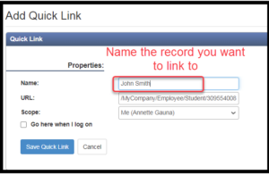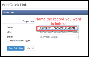 After clicking on the + you will be prompted to name the page you’d like to keep in your Quick Links. This could be a list (currently enrolled students) or a single record (John Smith).